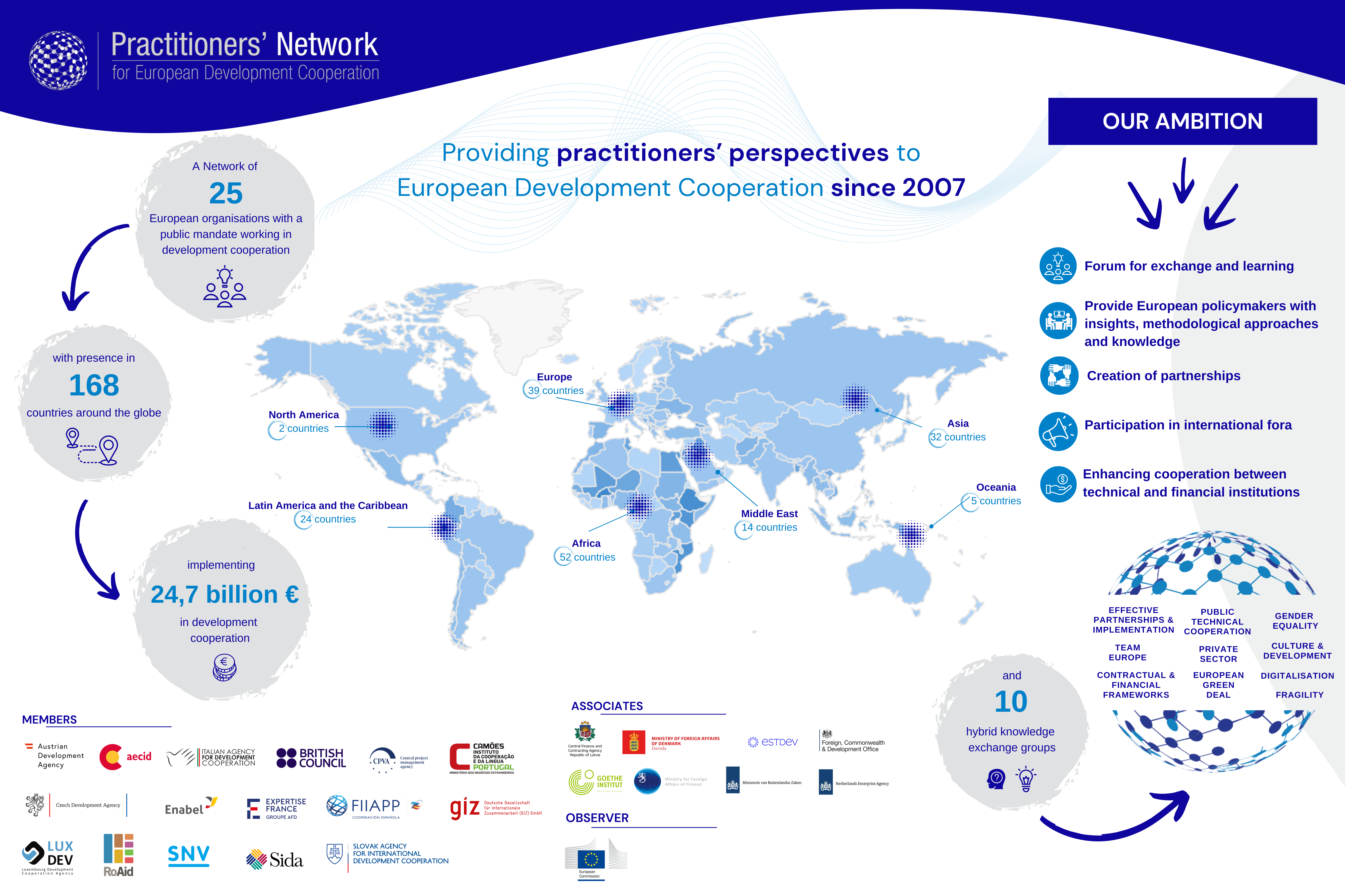 Founded in 2007, the Practitioners’ Network for European Development Cooperation is an open platform for exchange, coordination and harmonisation between European Development Cooperation organisations. Members use the platform to share their experiences and reflect on joint efforts in implementation.